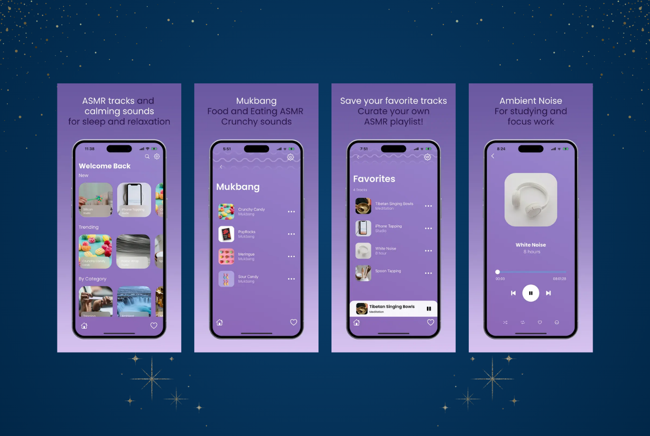Developed an iOS app offering soothing ASMR sounds, sleep tracks, and relaxation audio, with customizable playlists and a calming interface to help users reduce stress and improve sleep quality.